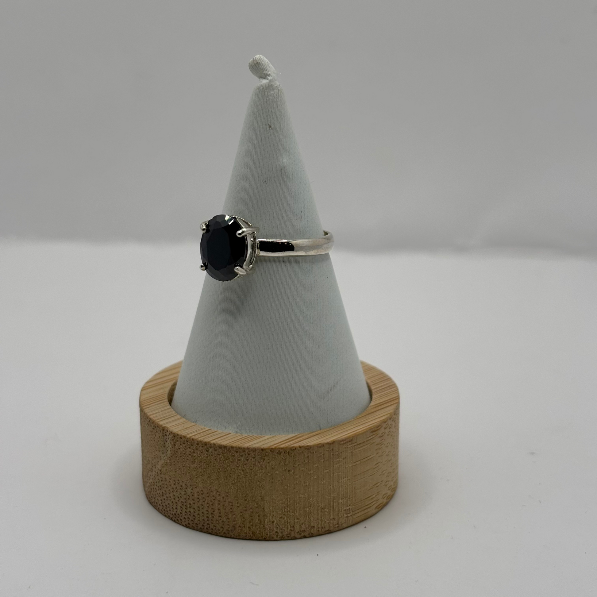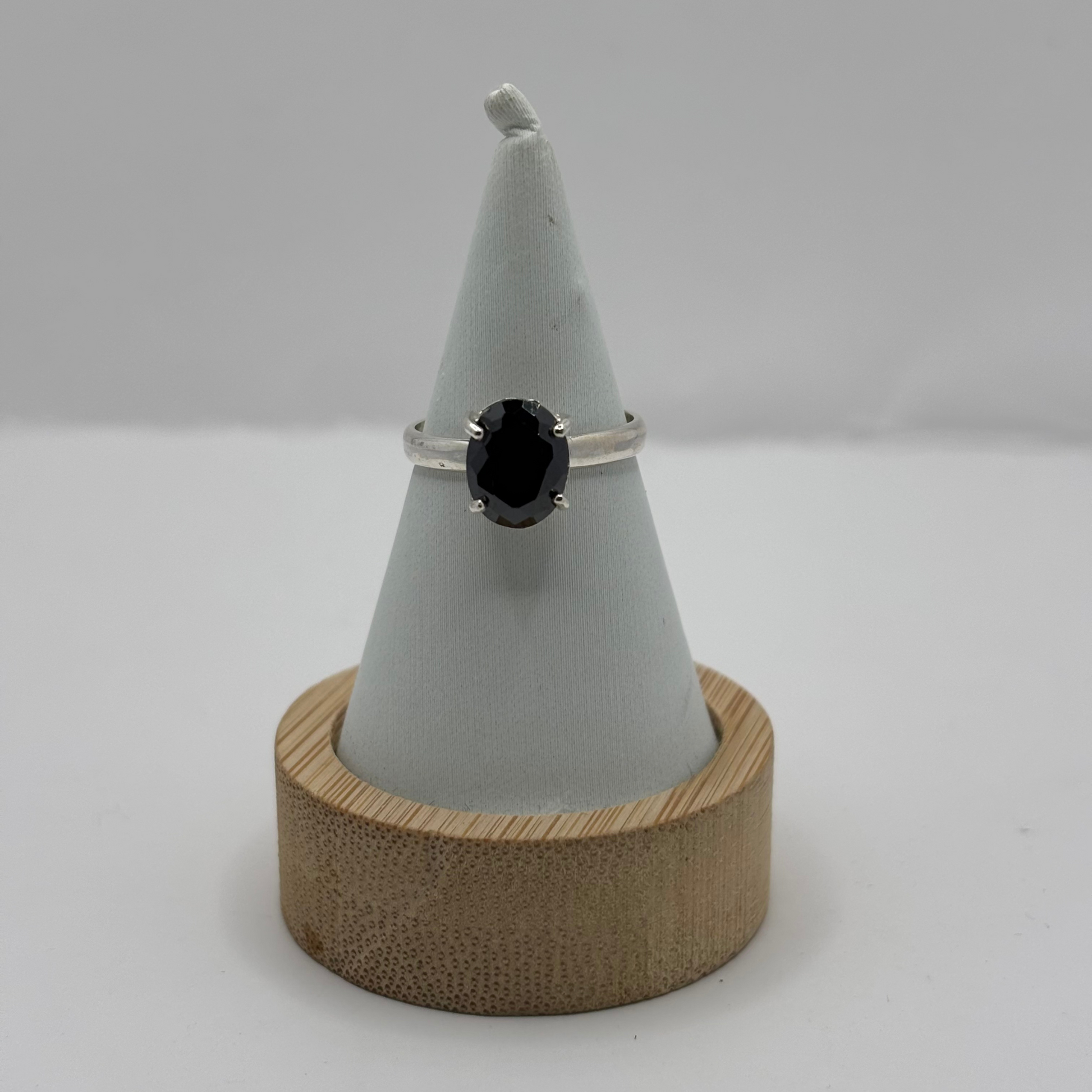 Elaborado en plata de ley 925 maciza, este anillo cuenta con un acabado pulido brillante y un engaste de garras que resalta la forma ovalada del circón negro central, logrando un contraste atractivo y atemporal.