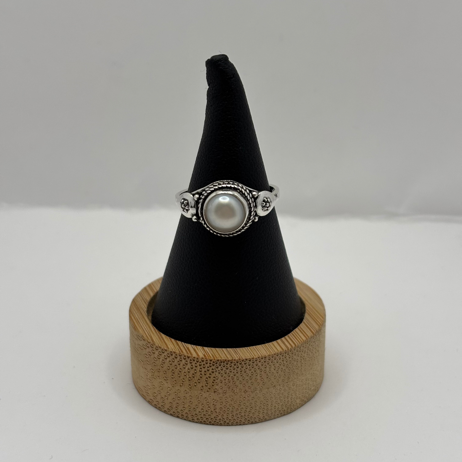 - Diseño: Solitario con perla central y detalles ornamentales en el aro.