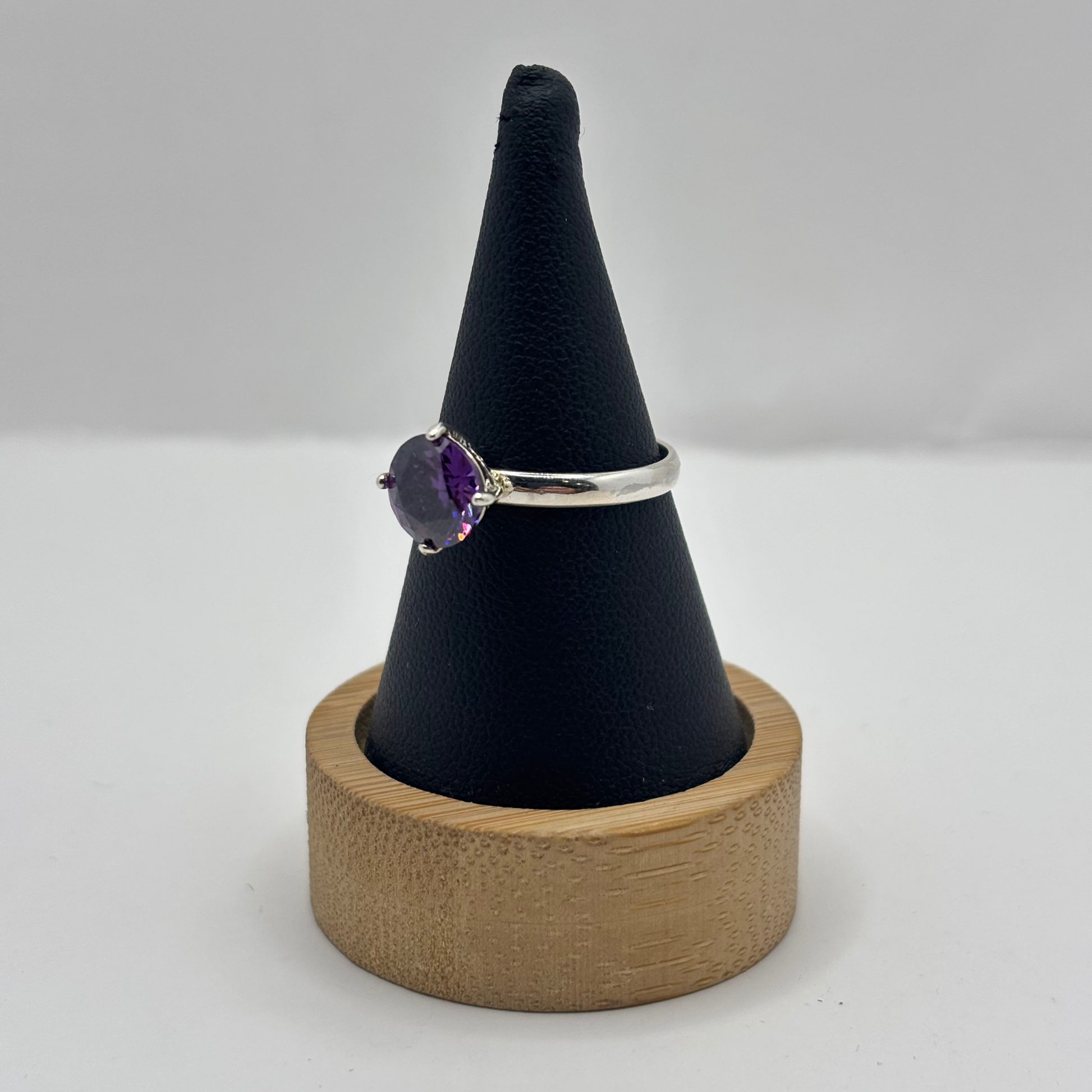 Elaborado en plata de ley 925 maciza, su aro pulido brillante sostiene una piedra morada de corte redondo, montada en engaste de garras que resalta su intensidad y brillo. Su diseño minimalista lo convierte en una pieza versátil y atemporal.