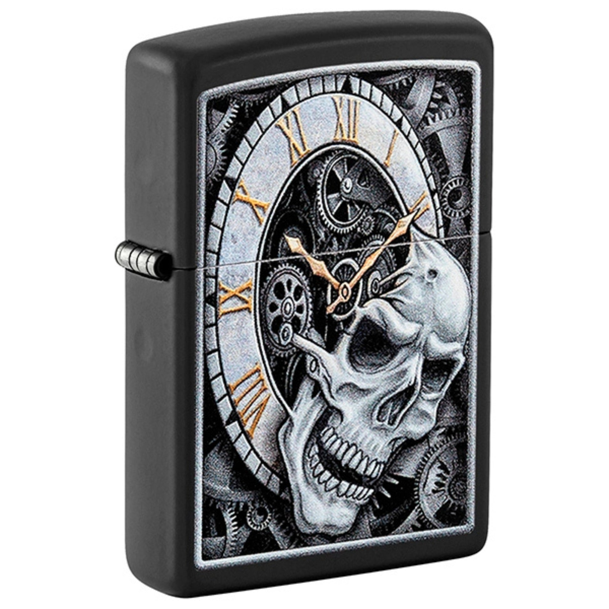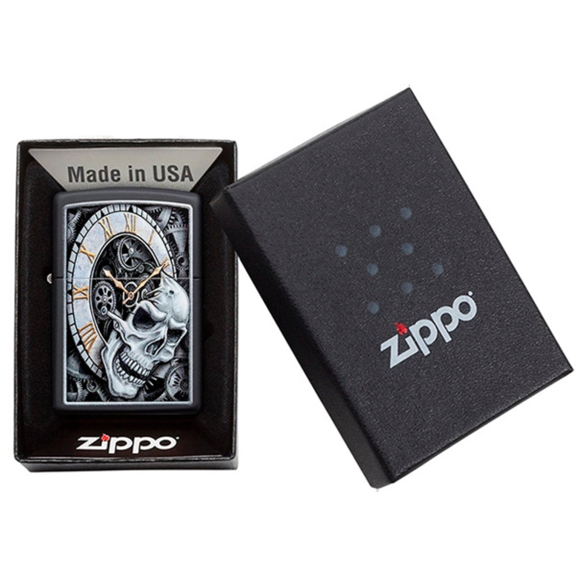 El encendedor Zippo Black Matte presenta un diseño oscuro y reflexivo que recuerda que el tiempo nunca se detiene. La ilustración, de estilo sombrío, transmite una fuerte carga simbólica y visual, ideal para quienes buscan un diseño con carácter y profundidad.