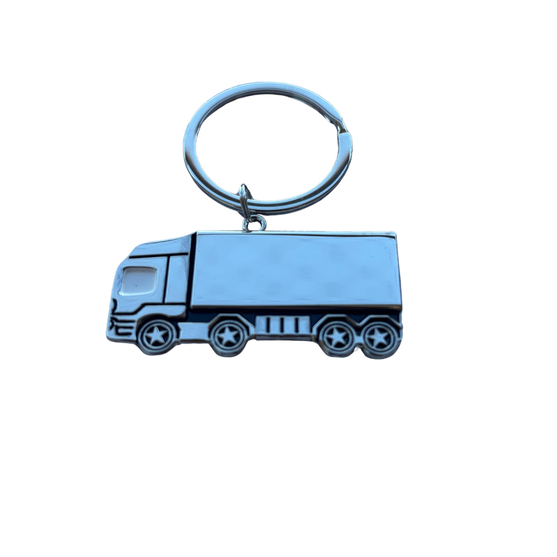 Llavero metálico con forma de camión de carga, ideal para conductores, empresas de transporte y obsequios corporativos. Acabado brillante con detalles definidos y superficie lisa para grabado.
